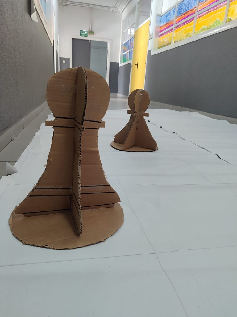 El alumnado de 2º de ESO de la Escuela María Reina realiza un ajedrez gigante para niños de Educación Infantil. Este proyecto ayudará a los niños pequeños a aprender cosas diferentes: aprender a esperar, a tener paciencia, etc. Hasta ahora han utilizado un pequeño robot para trabajar el movimiento espacial y la lógica matemática, pero a partir de ahora pueden mejorar eso caminando por el tablero de ajedrez como si ellos fueran un robot. Sin embargo, el objetivo más importante es que los niños se diviertan y disfruten.