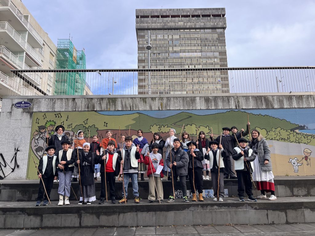 Auzoko kaleak erritmo bereziz bete dira gaur, Lehen Hezkuntzako 4. mailako ikasleei esker. Makilak eskuan eta ondo pasatzeko gogo handiz, mutilak eta neskak ikasgelatik atera dira Santa Agedaren musika auzokideen ateetaraino eramateko.
